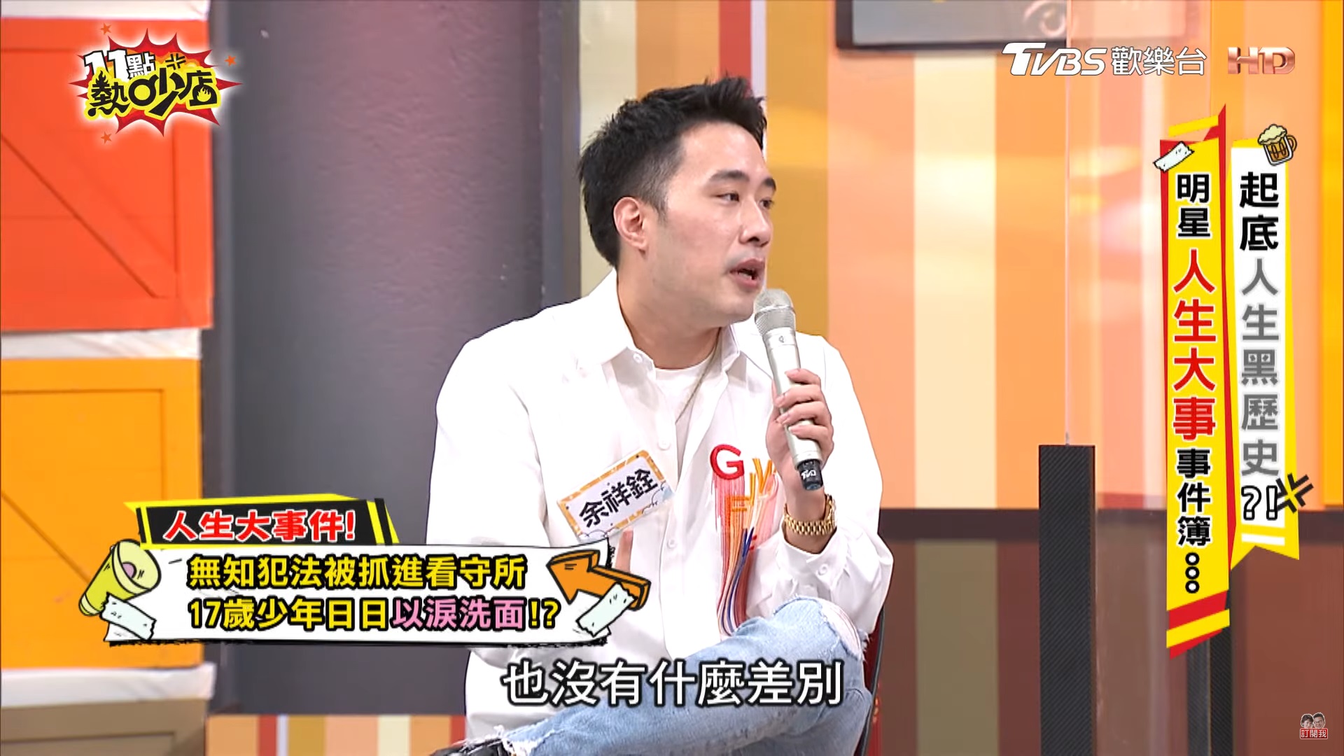 回想起當時的狀況,余祥銓表示一開始沒辦法適應,還會有很多宗教團體來感化他,由於誰都不認識,身邊還很多江湖兄弟,再加上完全沒預料到事情會變成這樣,所以每天以淚洗面,余祥銓跟李亞萍第一次來探望時,「馬上就大哭了」,也慶幸當時還未滿18歲,所以沒留下案底,但他自虧:「可是我跟沒有案底也沒有差別」,Melody緊接著吐槽:「因為你全世界都知道」,來賓聽了全都笑翻!