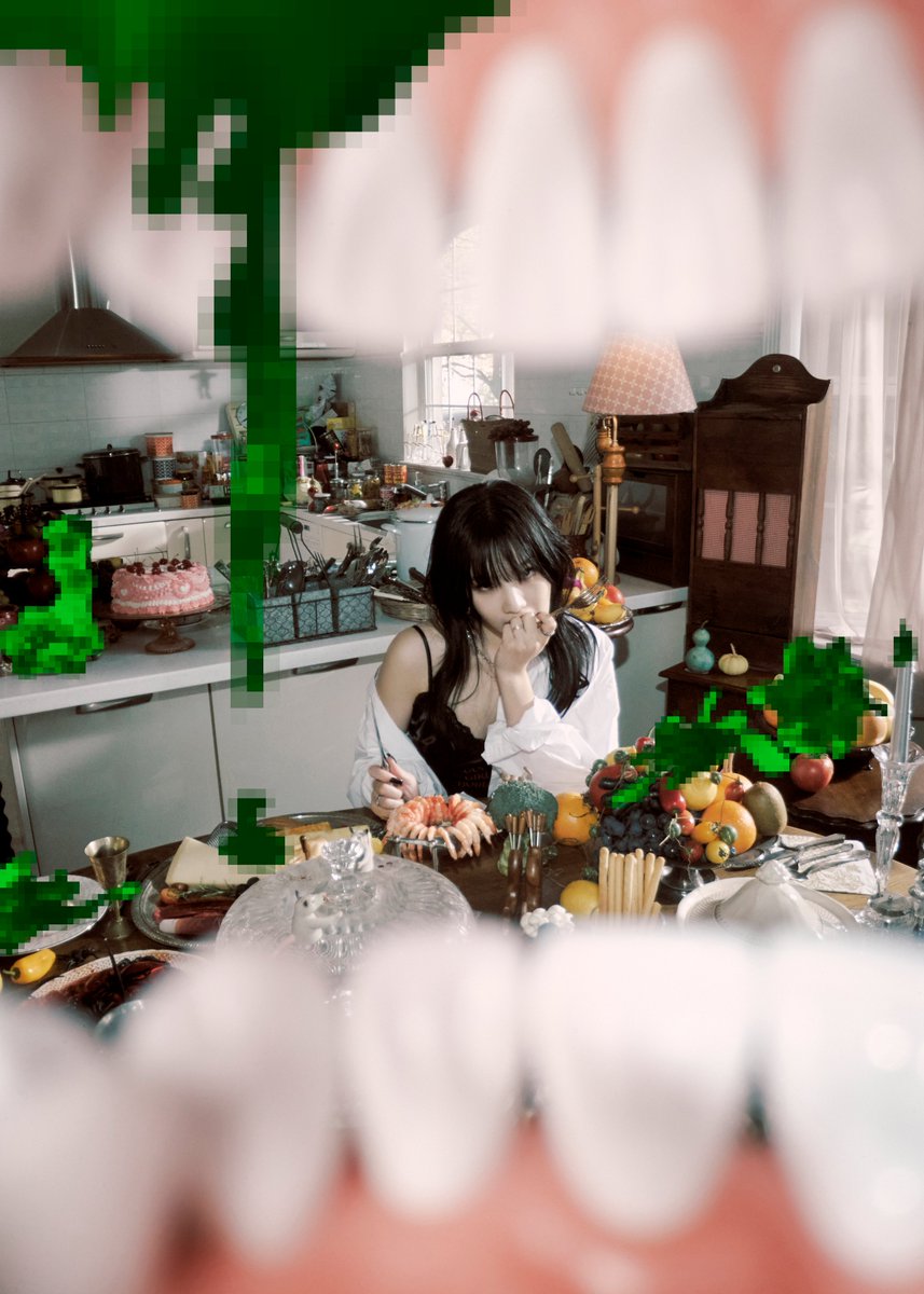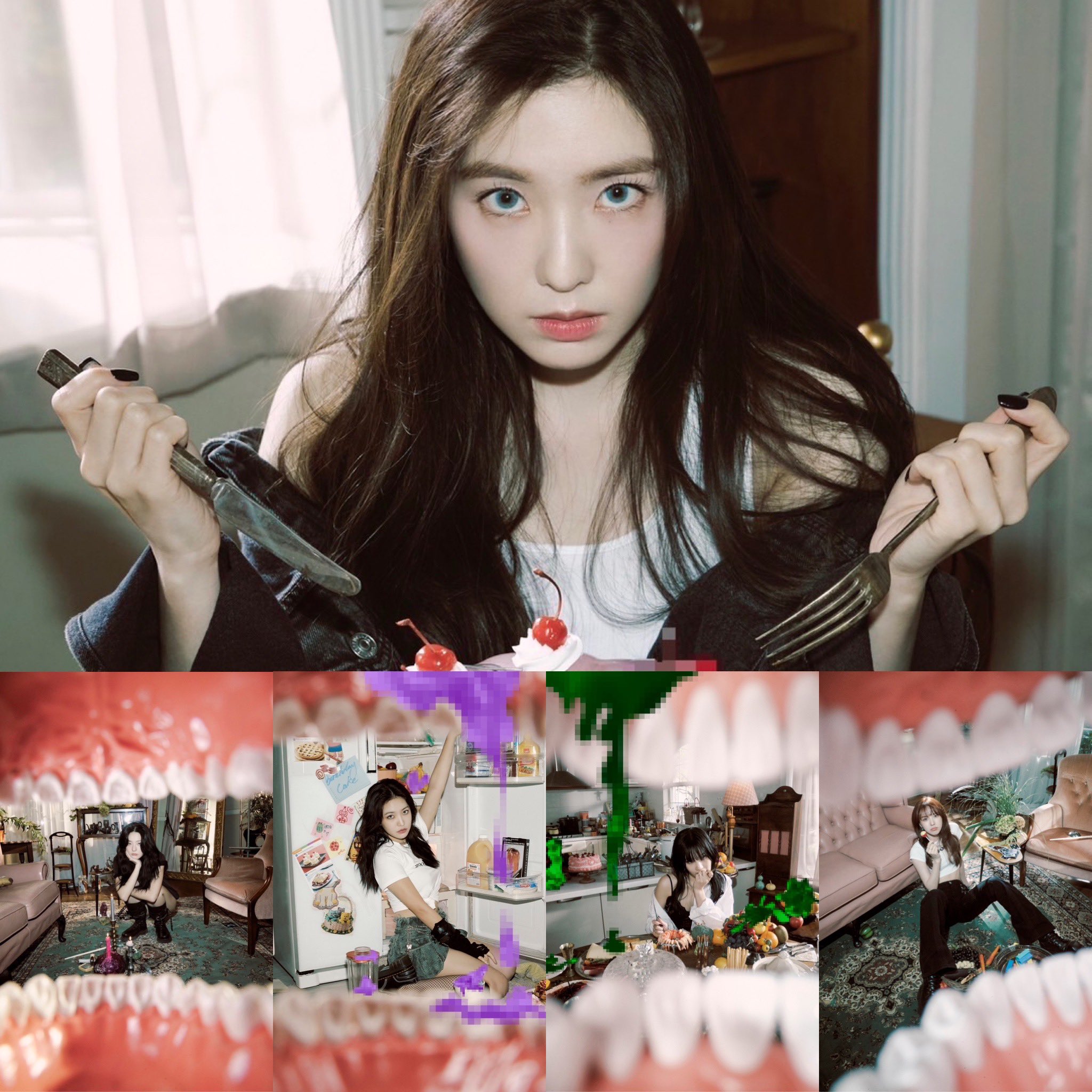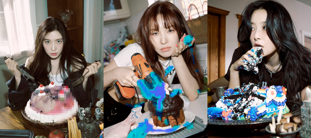 而除了牙齒照外,當中Irene、澀琪吃蛋糕的照片也有些詭異,Irene的蛋糕中不但有數隻蜘蛛,一部分還被打上了馬賽克,而澀琪則是不拿餐具,直接徒手抓蛋糕吃,另外Wender在照片中也拿著的電鑽噴灑著藍色打馬賽克的液體,讓原PO都不禁懷疑公司是否是故意為了吸引大眾的好奇心才這麼做!