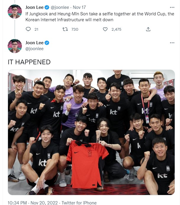 事實上,大韓足球協會(KFA)20日PO出南韓隊的備戰影片中也驚喜出現柾國,他不僅和教練團、球員握手合照,還獲得了一件南韓隊紅色球衣!罕見與球星孫興慜同框更是還在網路上引起一陣熱議,不僅讓粉絲興奮留言直呼,「國寶見國寶!」更有記者表示,「如果柾國和孫興慜在世界盃合照,韓國網路將會癱瘓。」