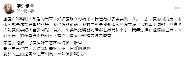 根據《三立新聞網》報導,李妍憬看完圤智雨寫的控訴文後,心情大受影響,更哽咽表示:「他真的很過分,我現在整個人在抖,他有尊重過我嗎?」她隨後在臉書無奈回應:「風度在哪,明眼人都看的出來,知名度現在你有了,我還有很多事要做,在弄下去,真的很疲累。」透露自己一直處於高壓狀態,從來沒有逃避問題,認為如果不面對,就會沒完沒了。