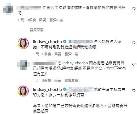 不僅如此,還有人狠酸「他看起來覺得自己超屌、表現超好」,認為多虧卓君澤是體育主播,所以威廉才有辦法接到球場的主持工作,對此,她表示:「他能有這主持是雲豹力邀,跟我一點關係都沒有。再者,他知道自己表現需要改進很多地方,並沒有覺得自己超屌。」一一回覆酸民的攻擊,相當霸氣。