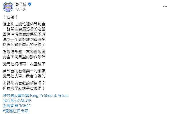 隨著第59屆金馬獎的得獎名單公布後,黃子佼在臉書發文表示,當天正好跟孟耿如在約會,期間一直有在關注金馬得獎名單,當得知許芳宜獲得最佳動作設計獎時,「我歡呼開心的不得了」,並表示:「愛馬仕皮帶,我會守諾的。」