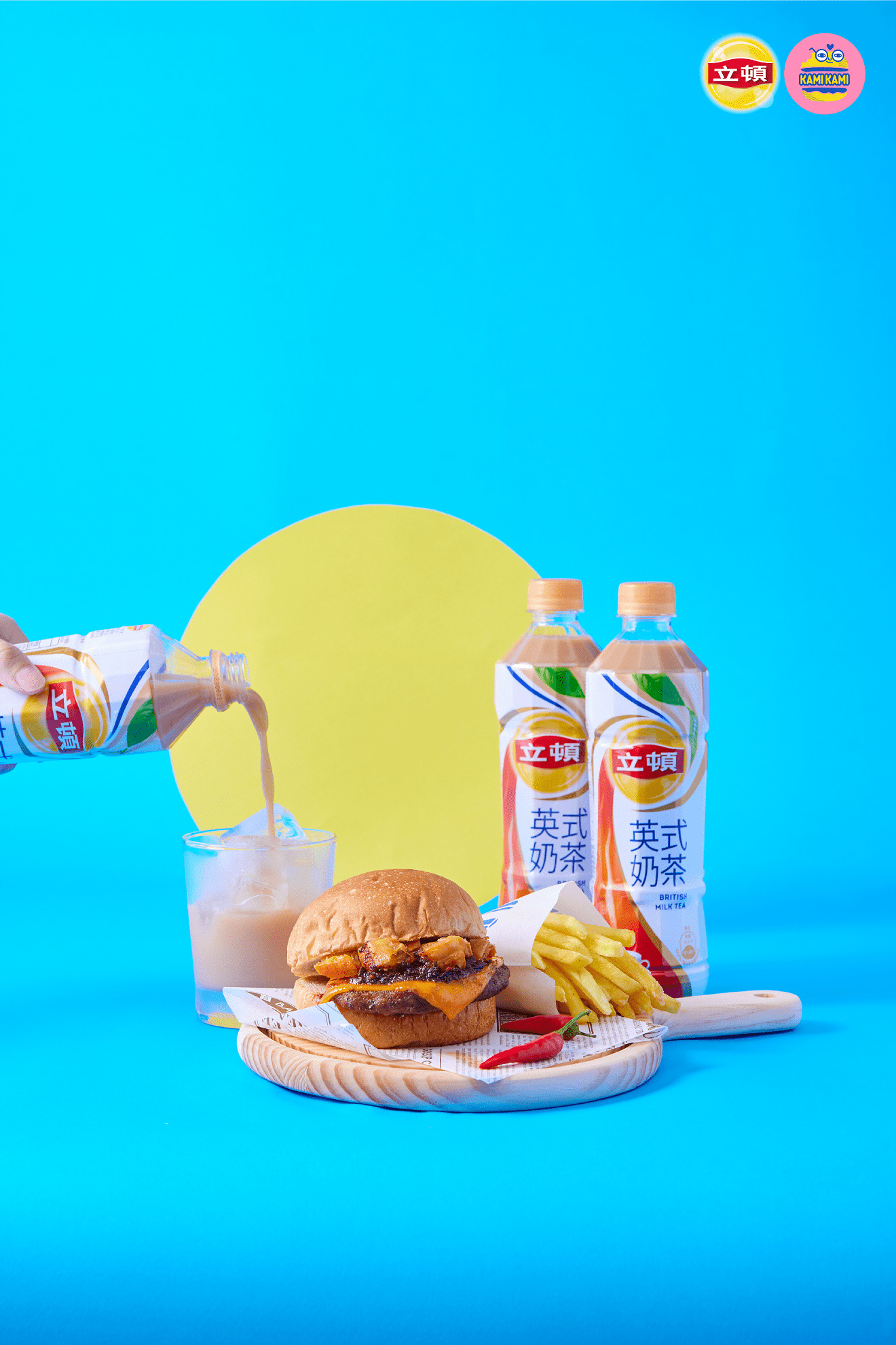 本次聯名限定套餐包含一顆「三點立頓麻辣奶茶堡」、一份附餐薯條以及立頓英式奶茶 535ml 一罐。此外,立頓為回饋消費者更加碼,只要下單任一 KAMIKAMI BURGER 套餐(不含聯名限定套餐),即加贈立頓原味奶茶 250ml 一罐,號召所有奶茶控一起「三點立頓、堡餐一頓」!