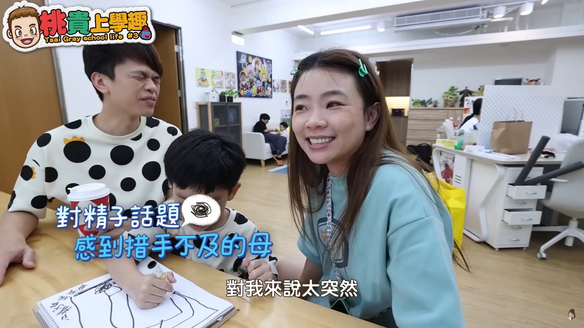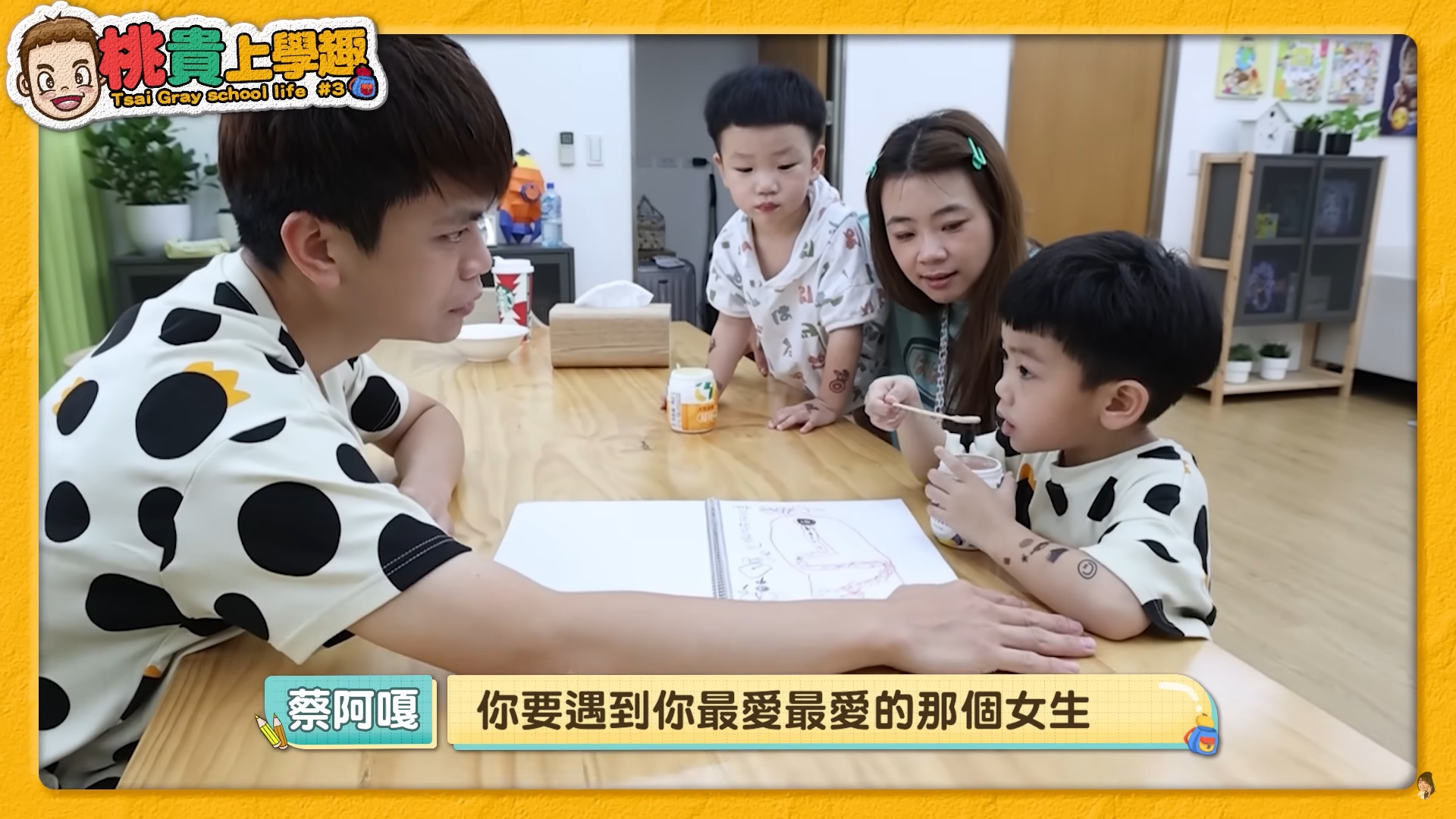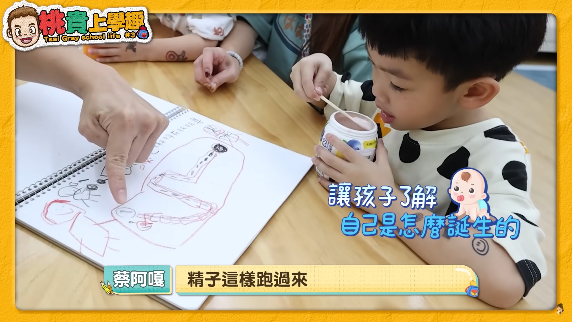 不僅如此,蔡阿嘎透過蔡桃貴畫的馬路圖,以簡單的方式說明精子與卵子相育的過程,並告訴他:「你要遇到你最愛最愛的那個女生」,才可以把精子送到卵子,沒想到蔡桃貴一聽完立刻用手指向二伯,他趕緊解釋:「不可以是媽媽啦!」旁邊的蔡波能則說:「我喜歡爸爸」,可愛的互動讓全場都笑翻!