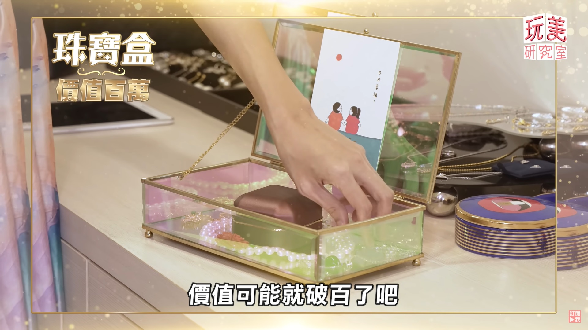 接著,一行人來到主臥室的化妝空間,若綺拿出了一盒婆婆送的「百萬珠寶」,裡面有由珍珠及紅珊瑚做成的項鍊,就連婚戒都是來自婆婆的傳承,而楊昇達則是親自參與設計,將原有的珠寶多加上井字遊戲的框,他表示井字遊戲如果把第一步下在中間比較容易贏,所以把最有優勢的位置留給了老婆,但是希望兩人能夠一起玩下去!對此,若綺表示:「他們真的給我很多愛,所以我才可以去愛更多人,然後再愛昇達」!