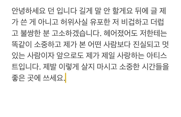 對於這則不實貼文,Dawn澄清表示,「我簡潔扼要的說,這則貼文不是我寫的,我會對散布這些假訊息的可悲骯髒網友提告!就算和泫雅分手了,她仍還是我最珍貴的人,是我認識最真實可敬的人,她永遠是我最喜歡的藝人。」並且Dawn還在文末呼籲這位網友不要將寶貴的時間浪費在散布不實訊息!