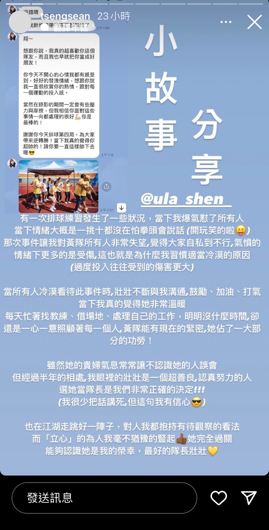 接著,曾奕翔表示:「當所有人冷漠看待此事件時,壯壯不斷與我溝通、鼓勵、加油、打氣,當下我真的覺得她非常溫暖」!認為壯壯要處理工作跟團對的事情已經很忙碌,卻還要照顧到每一個人,「黃隊能有現在的緊密,她佔了一大部分的功勞!」