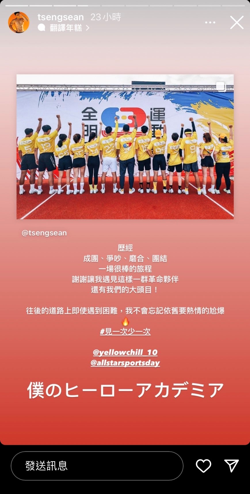 經過了半年的相處,在曾奕翔的眼裡,壯壯是一個善良又努力的人,「選她當隊長是我們非常正確的決定!」認為自己在社會上走跳了一陣子,對人都會抱持著有待觀察的想法,但是壯壯的為人是能夠讓他毫不猶豫豎起大拇指。另外,還曬出了黃隊的團照並表示:「歷經成團、爭吵、磨合、團結,一場很棒的旅程,謝謝讓我遇見這樣一群革命夥伴,還有我們的大頭目!」如今賽季已經到了末端,他笑說是「見一次少一次」!
