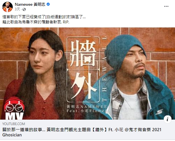中國爆發白紙革命後,各地都傳出抗議活動,也引起了全世界的關注,其中時常關注時事的黃明志轉發了自己的歌〈牆外〉並表示:「這首歌的下面已經變成了『白紙運動』的討論區了,藉此歌曲為烏魯木齊的罹難者默哀,RIP。」其實,這首歌當初是為了金門觀光量身打造的歌,MV的故事是在描述兩個小朋友互相有愛卻頻頻遭到阻擋,兩人始終隔著一道牆聯絡彼此,雖然用盡各種方式躲避控制,但最後還是以失敗收場。