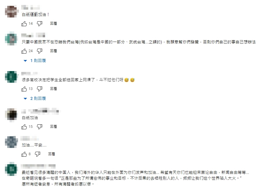 如今發生白紙革命,許多網友再度聽到歌曲時,都紛紛在下方留言哀悼表態,「台灣人挺要自由的中國人,我站在牆外等你!」、「支持白紙革命,勇敢的中國人請站出來,爭取你們的民主自由和人權!」、「加油!一定要推倒高牆!我們在牆外等你們」,還有中國網友表示:「作為一名大陸人,衷心祝福臺灣人民守護好自己的幸福,並期待著有一天我們會在同一片藍天下真正呼吸著」、「謝謝可愛的臺灣,我會努力到達牆外的世界,也祝你們永遠自由!」