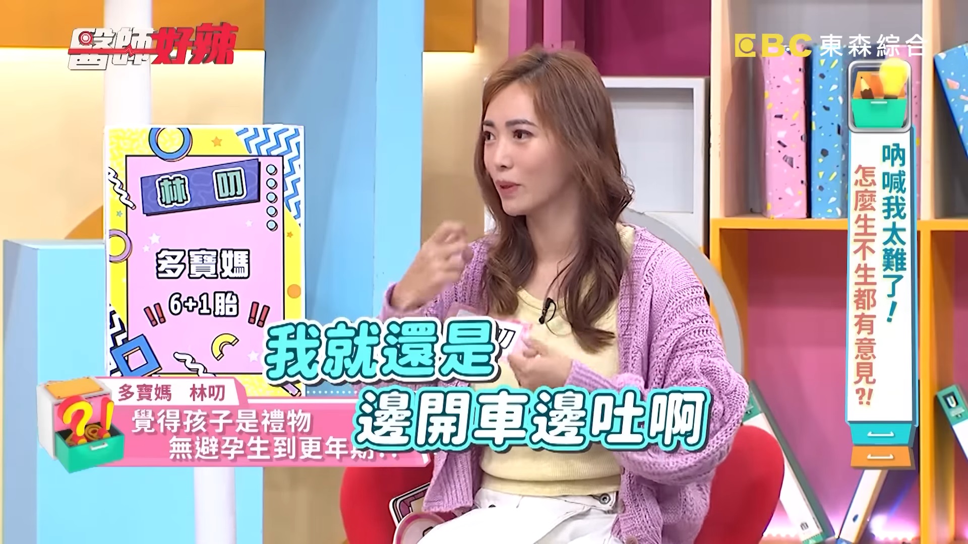 至於懷孕期間,如果害喜或不舒服要怎麼同時照顧六個小孩,Sydney表示:「很忙的時候,好像沒有什麼時間害喜」,像是她現在還是要開車接送孩子去上才藝班,「我就還是邊開車邊吐啊!」嚴立婷認為她與先生感情一定很好,才足以支撐這些事情,沒想到她竟自爆即使結婚12年,一周還會歡愉三次,全場聽了瞬間笑翻!