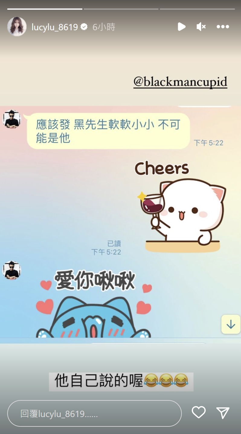 針對圤智雨的猜測,Lucy 7日在IG限時動態做出回應,她表示自從新聞曝光後,就一直收到大家的私訊,她先是安撫大家「不要緊張」,隨後表示:「黑先生無時無刻身邊都是我的監視器,連回老家都帶著監視器回去,24小時被我監控著」,斷言影片男主角不可能是黑男。不僅如此,Lucy接著又曬出與黑男的對話,只見男友看了她的動態後笑說:「應該發『黑先生軟軟小小,不可能是他』!」感覺得出來兩人的信任感沒有因此被破壞。