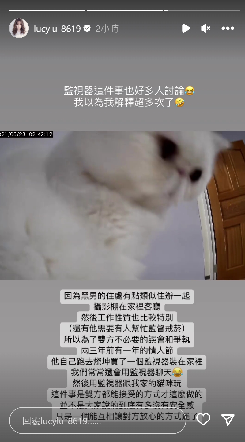 不過,有部分網友對於Lucy用監視器時時刻刻盯著黑男感到不滿,她解釋男友的住處是住辦合一,客廳就是攝影棚,再加上工作性質特別,同時還需要有人監督戒菸,「所以為了雙方不必要的誤會爭執,兩三年前有一年的情人節,他自己跑去燦買了一個監視器裝在家裡」,兩人還會透過監視器聊天跟逗貓,強調「這件事是雙方都能接受的方式才這麼做的」,不是沒有安全感,而是讓彼此放心的一種方式而已。