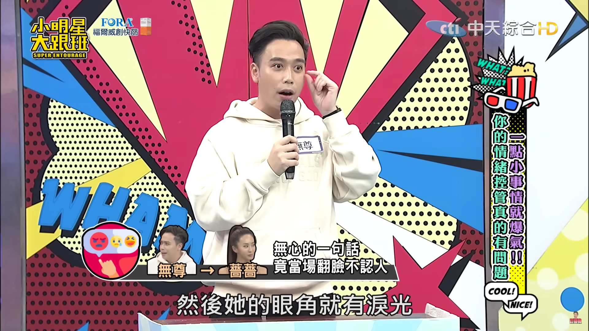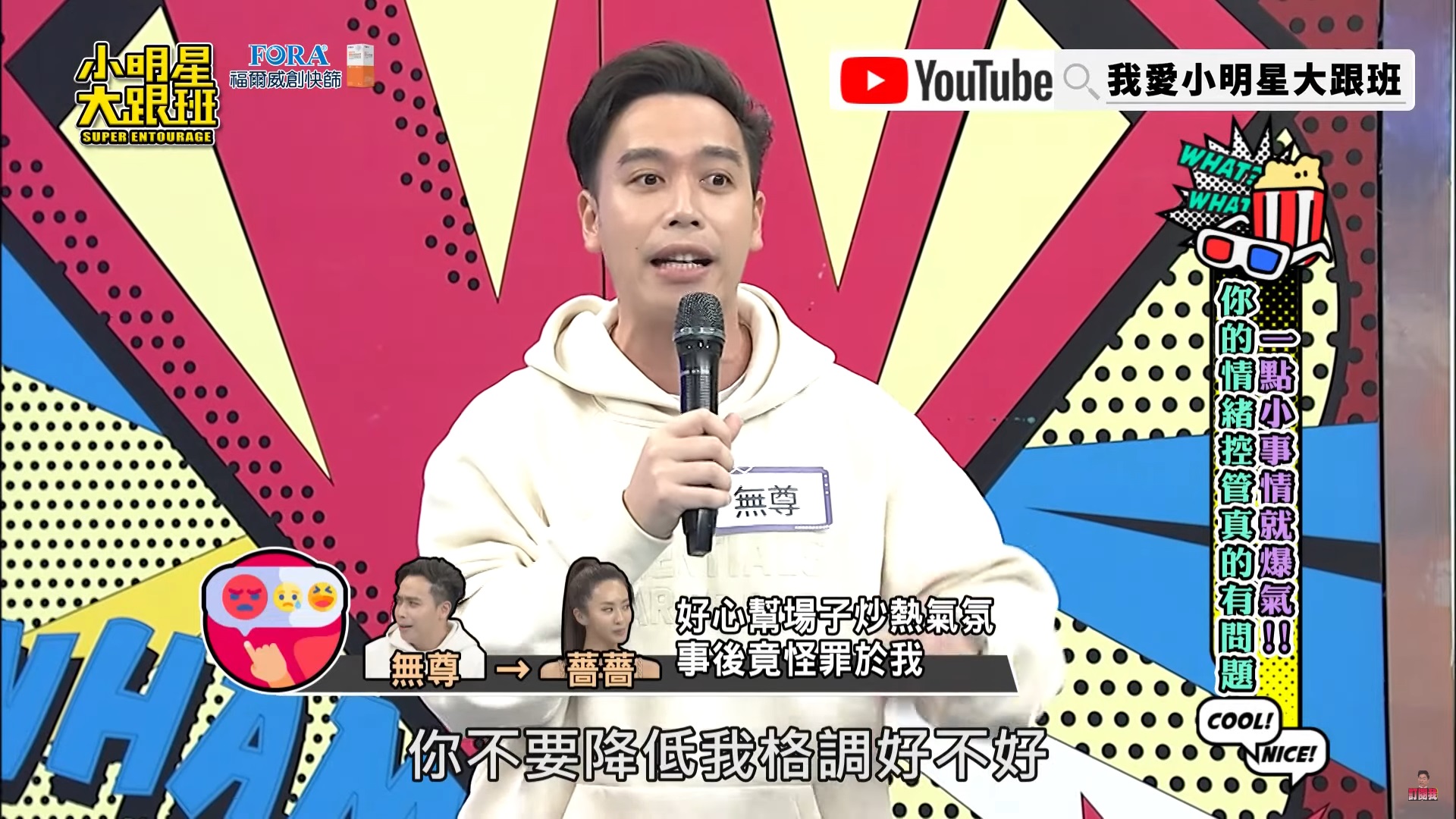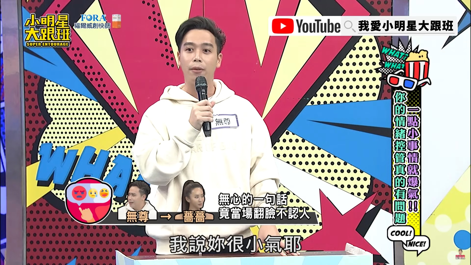 藝人薔薔日前在節目《小明星大跟班》遭到無尊控訴「情緒管理不佳」,無尊透露有一次與薔薔、薔薔的曖昧對象一起吃飯,他為了炒熱氣氛而講笑話,沒想到卻被薔薔大罵是「降低格調」,薔薔反控因為吃了無尊給的辣椒,害她當場吐水、噴鼻涕,在對象面前出洋相,甚至在低潮的時候,還被無尊虧「小氣」,害她當場走心泛淚!
