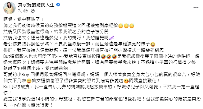 賈永婕8日在臉書分享搭機回台發生的事,她透露這次回台灣原本買商務艙機票,卻因為一些緣故變成了豪華經濟艙,由於機上人數眾多,沒有連位,所以只好跟老公分開坐,沒想到竟發現位置旁邊竟然是「嬰兒」,她當下心想,「我的媽呀!我想睡覺啊!」還開玩笑說:「老公你要跟我換位子嗎?不要我坐最後一排,而且旁邊是年輕漂亮的妹子~」