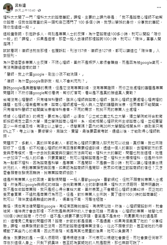 呂秋遠點出有許多民眾誤以為「心理師只要陪人聊天就可以收錢」,但實際上,心理師的所有回應都是經過訓練,但理科太太的課程則會讓民眾的誤會更深。他更直言:「如果認為諮商師只是閒聊,民眾如何建立對諮商師的信任?又怎麼會願意在發現困難時,找專業諮商師協助?」