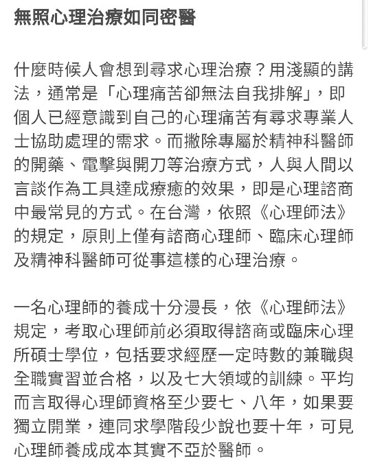 紀岳良日前貼出過去撰寫的文章,內容提到心理師的養成十分漫長,「如果欠缺相關知識與實做訓練,或是有意圖上的偏差,稍不留意就會造成個案心理二度傷害。」像是有些無照者會認為自己已經掌握醫療技巧及知識,就誇大地宣稱療效,但是只要事情變得無法處理時,「如同江湖郎中一樣,沒有任何的倫理與負責心態,甚至有些不肖人士,假借心理治療之名,謀己私利二度傷害個案。」