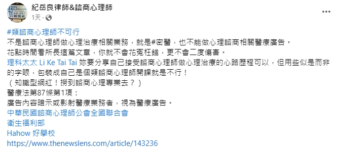 紀岳良認為「不是諮商心理師做心理治療相關業務,就是密醫,也不能做心理諮商相關醫療廣告。」他還直接標記理科太太並喊話:「用些似是而非的字眼,包裝成自己是個類諮商心理師開課就是不行!」至於台北市衛生居稱無法判斷違法,他不滿表示:「『影射心理治療/使人誤認她有心理諮商專業』,違反心理師法第27條第2項。光是「諮商筆記」就明顯踩紅線。」認為意圖不是重點,只要寫出來就是違法。