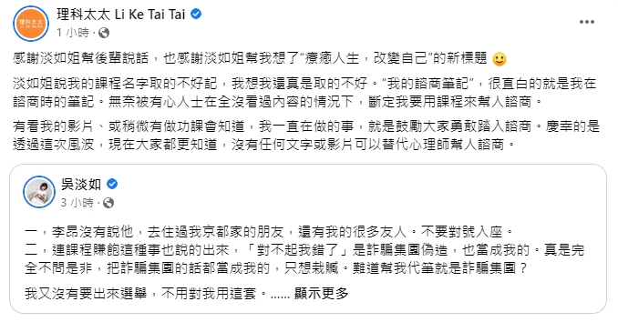 針對外界的各種質疑聲浪,理科太太12日轉發吳淡如的文章並表示:「感謝淡如姐幫後輩說話,也感謝淡如姐幫我想了『療癒人生,改變自己』的新標題~」指出吳淡如曾說課程名字不好記,「我想我還真是取的不好」,起初只是想要直白地傳達課程內容,「無奈被有心人士在全沒看過內容的情況下,斷定我要用課程來幫人諮商。」她認為自己一直在做的事情就是鼓勵大家勇敢諮商,「慶幸的是透過這次風波,現在大家都更知道,沒有任何文字或影片可以替代心理師幫人諮商。」