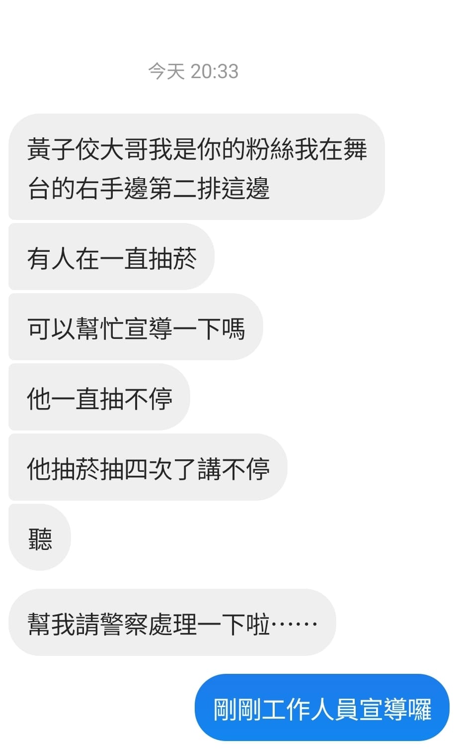 由於當天現場人數眾多,許多人無法輕易找到工作人員幫忙,因此紛紛私訊黃子佼,希望能代為轉達或幫忙,只見有些人向他反應視線被擋住,有些人反應遭到伸鹹豬手,還有人反應抽菸問題,不過黃子佼表示:「分工很細的大舞台,我真的不知道要問誰」,並無奈笑說:「主持人要管很寬齁~」