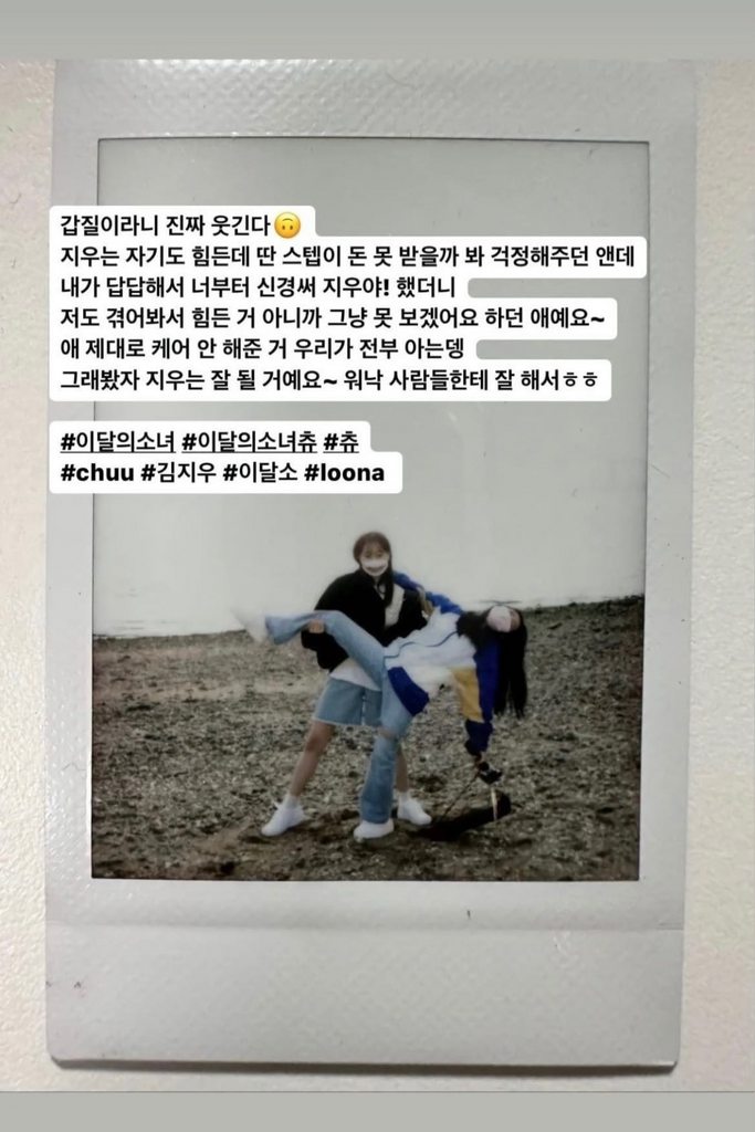 其實先前本月少女的經紀公司BBC就遭爆料營收困難、未支付員工薪水一事,其後Chuu在節目上自白0收入一事間接證實謠言為確。自Chuu強制退團一事被宣布,本月少女成員金賢真就透過社群表示「頭痛,心也痛,真的很生氣」,並表示:「Chuu現在比任何人都更心痛,請大家要多多支持Chuu。」當有粉絲擔心賢真的舉動可能會招來罵聲時,她也坦率直言:「我沒被罵的理由,因為我又沒做錯什麼。」
