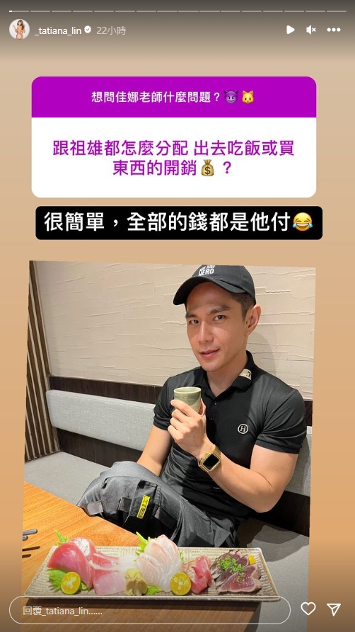 藝人佳娜與祖雄大方認愛,兩人時常在網路上高調放閃,也經常回答感情問題,像是她日前就透露在烏克蘭沒有所謂AA制,出門都是由男生付錢,所以從小耳濡目染之下,也認為約會就應該由男生負擔,但她強調是「個人的想法」,對此,祖雄也分享了自己的觀點。