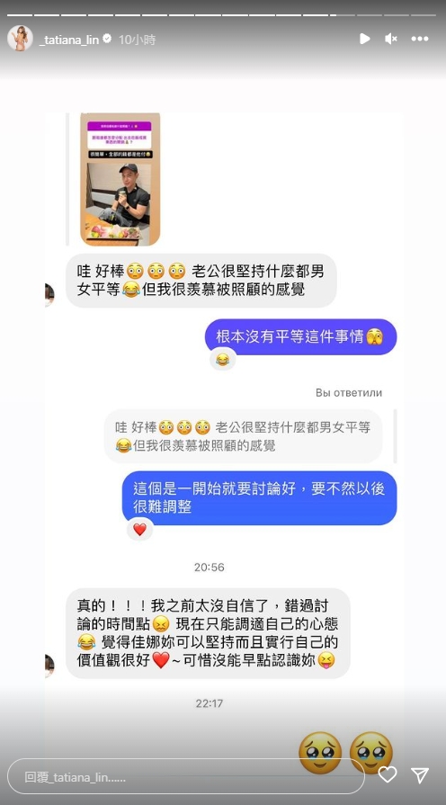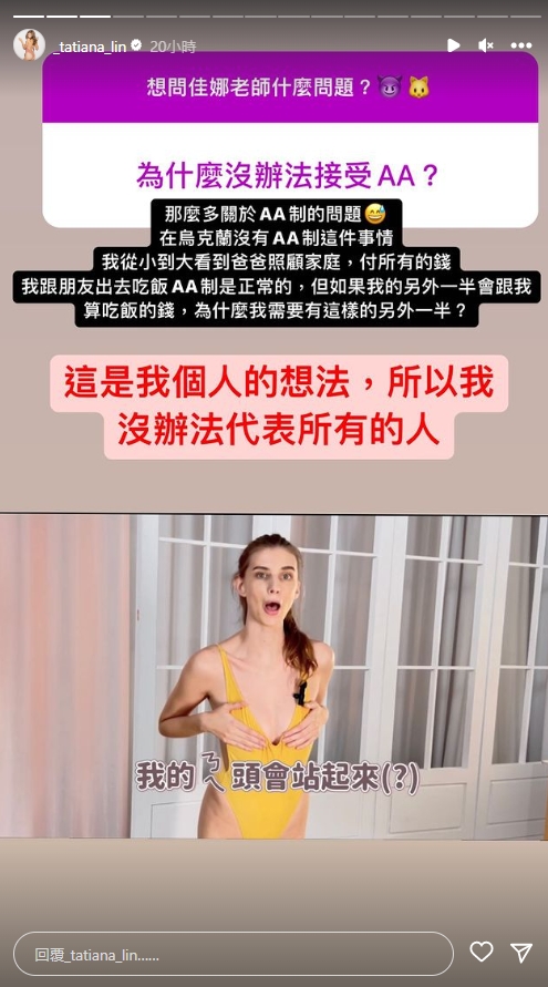 不僅如此,佳娜還在事後分享了網友的想法,有人表示:「老公很堅持什麼都男女平等,但我很羨慕被照顧的感覺」,佳娜則回覆:「根本沒有平等這件事」,應該要一開始就討論好,不然之後就會很難調整,對方透露就是因為已經難以解決,所以現在只能調整自己的心態;也有人認為AA制是種「不親密」的表現,意外掀起熱烈討論。