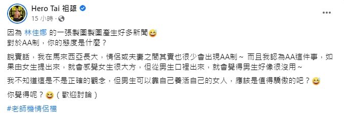 由於佳娜不接受AA制的想法備受討論,祖雄見狀也分享了自己的看法,他表示:「我在馬來西亞長大,情侶或夫妻之間其實也很少會出現AA制~」不過,如果這件事情是由女生主動提出,會因此覺得對方很大方,「但從男生口裡出來,就會覺得男生好像很沒用~」不確定是不是正確觀念,但他認為「可以靠自己養活自己的女人,應該是值得驕傲的吧?」