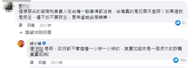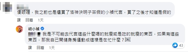 不僅如此,有網友直言:「這樣惡劣的廠商和負責人在台灣一點事情都沒有,台灣真的是犯罪天堂啊!」小禎回覆:「政府都不管這種一小條一小條的,其實加起來是一個很大的詐騙集團耶!」甚至還有人誤信假代言而購買,小禎則無奈說:「我是不可能去代言這些什麼喝的就瘦或是吃的就瘦的東西,如果有這些東西,那我自己開健身房運動成這樣是在忙什麼?」