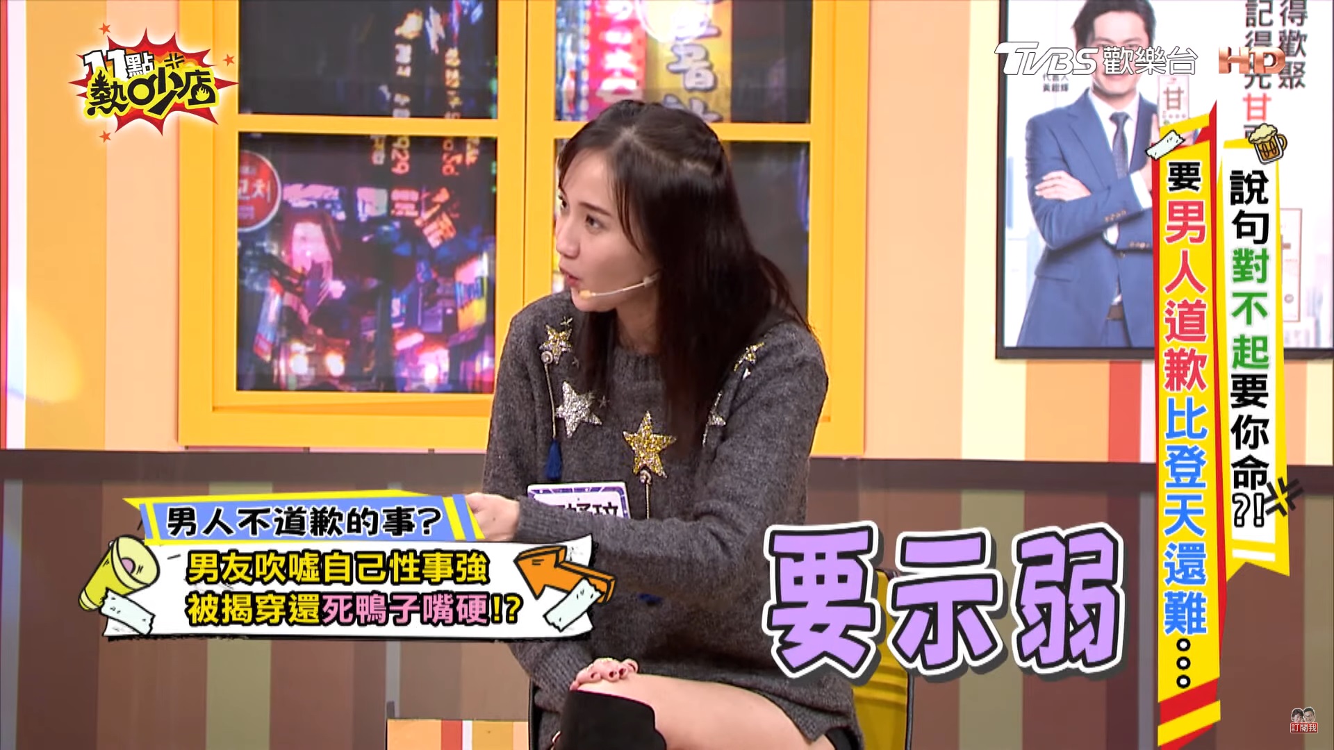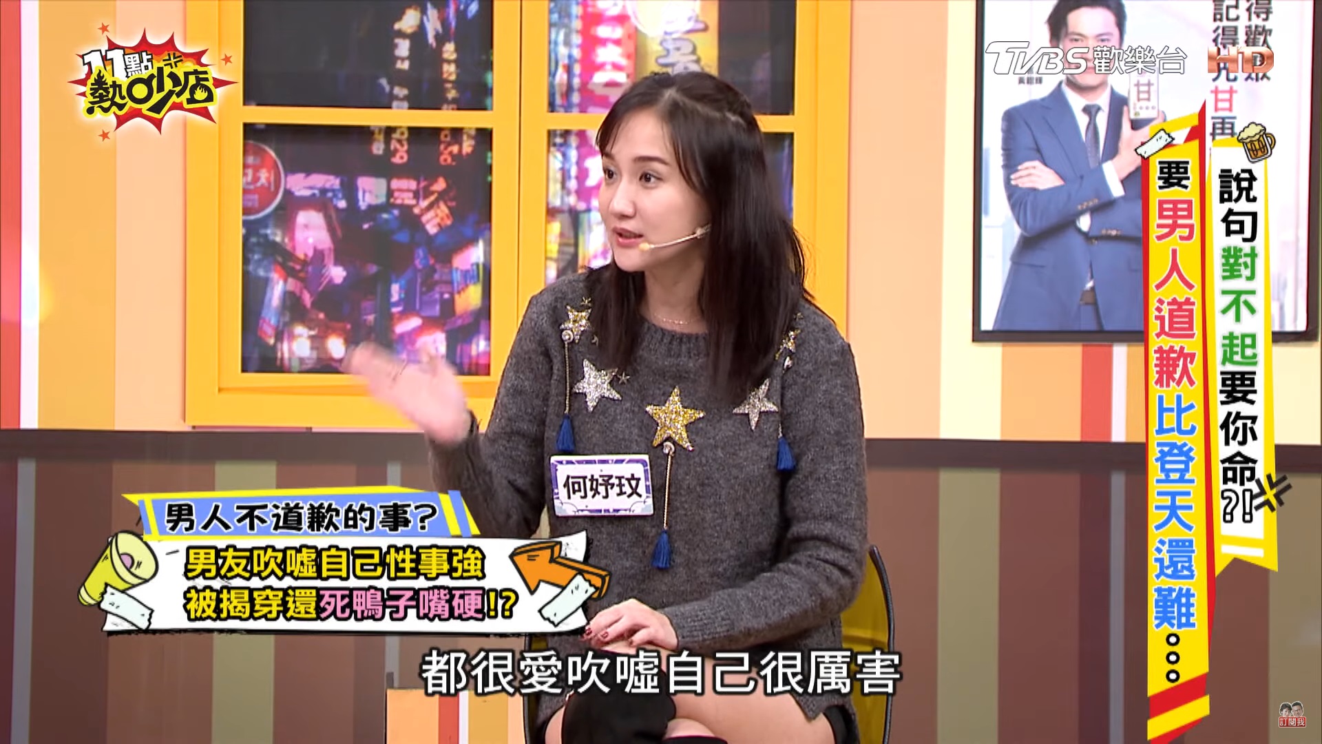 不僅如此,何妤玟還曾碰到一任男友愛吹噓性能力很強,沒想到開箱之後卻不是如此,她表示這不是道歉的問題,而是「示弱」,認為女生也有表達喜好的權利,但對方愛問又愛現,所以才會據實以告,也覺得男生如果連性能力這種小事都嘴硬,未來有事會更難商量。