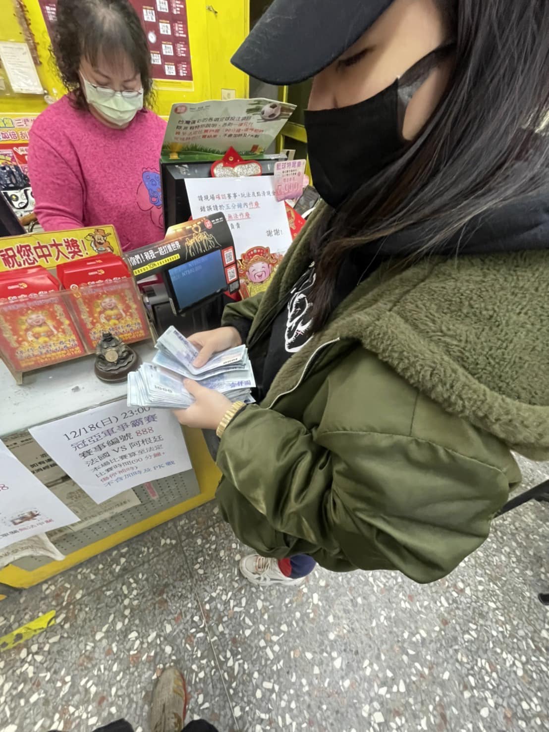 宛宛兒自世足開賽以來,經常向網友詢問下注意見,只可惜是輸多贏少,而在季軍賽更是賠了兩萬元!緊接著輪到冠軍賽時,她拿著大把鈔票現身彩券行並表示:「今晚之後不玩了,輸贏看這道!歐硬吼企(All in全下去)呀!」只見照片中,她手拿厚厚一疊的千元大鈔,全神貫注地數著鈔票,看起來就像要上戰場一樣嚴肅!