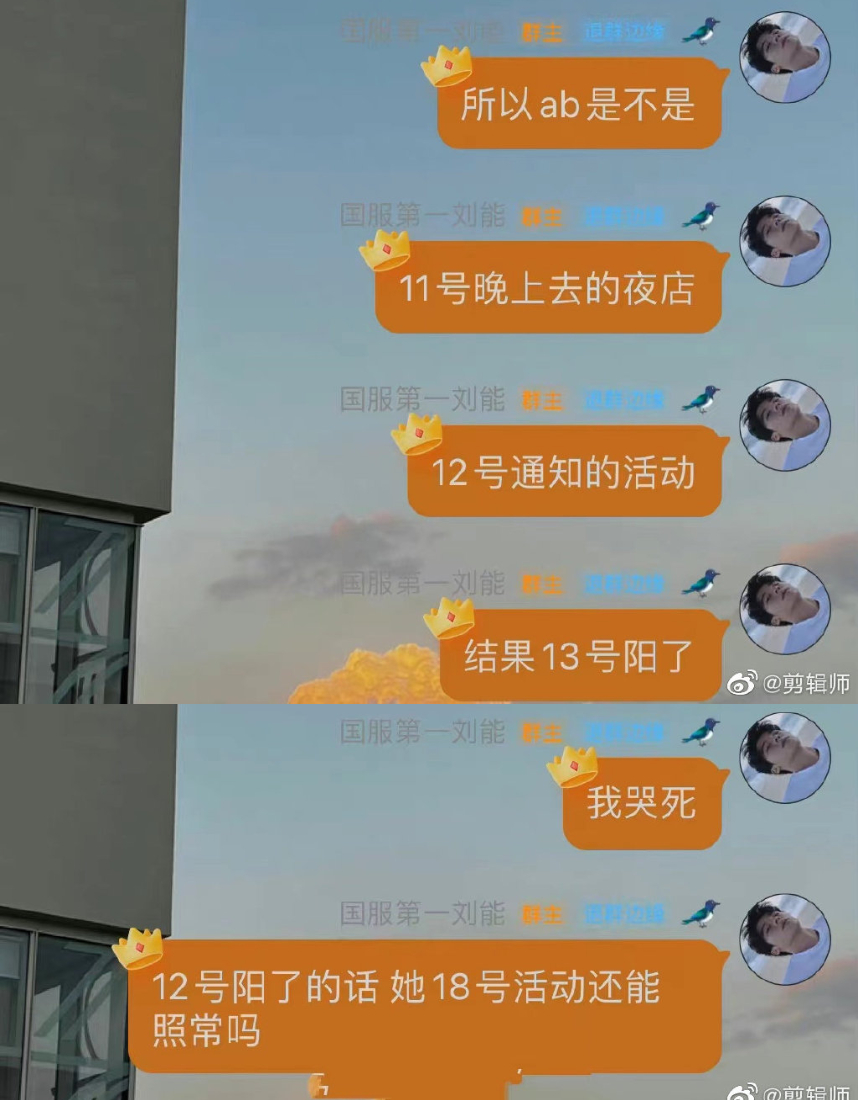 自稱是Angelababy閨蜜的網友「國服第一劉能」爆料,Angelababy11日晚上去夜店,隔天接下一個活動,沒想到13號就確診,只能取消剛敲定的活動,且那之後Angelababy持續神隱,儘管有許多網友都不採信此說法,網友又指出,和她同場的朋友已經有人確診,還曬出現場的照片證實消息,然而Angelababy方面目前沒有任何回應。