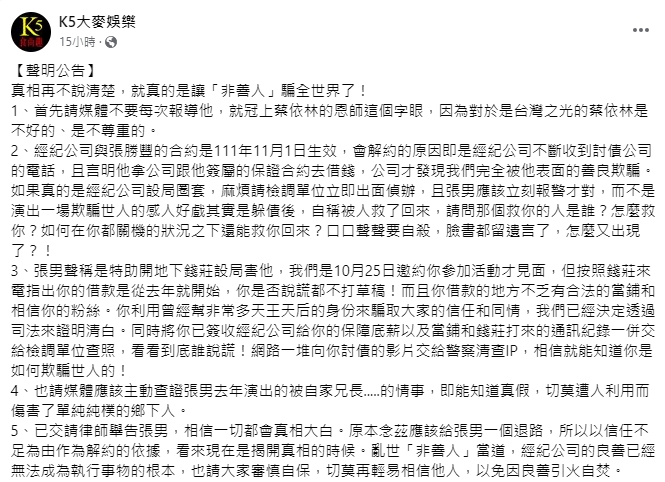 針對張勝豐的種種指控,前經紀公司透過臉書首度發出聲明,透露雙方合約是在今年11月1日生效,「會解約的原因即是經紀公司不斷收到討債公司的電話,且言明他拿公司跟他簽屬的保證合約去借錢,公司才發現我們完全被他表面的善良欺騙。」直言如果是公司設局,可以請檢調單位偵辦,「而不是演出一場欺騙世人的感人好戲」。