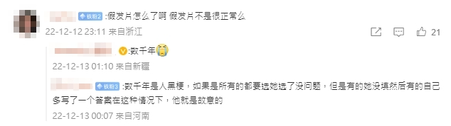 但也有網友認為,鞠婧禕粉絲有點太敏感,「假髮片怎麼了啊,假髮片不是很正常嗎」、「雖然但是,好像文字獄」,對此,有網友解釋,「數千年是人黑梗,如果是所有的都要選她選了沒問題,但是有的她沒填,然後有的自己多寫了一個答案在這種情況下,他就是故意的」、「下面那個頭也不回的往前走也有點那啥」。