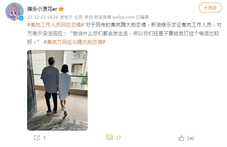 消息曝光後,陸續有其他陸媒曝光兩人約會的照片,對此,有記者聯絡秦嵐工作室,對方竟無奈回應,「我說什麼你們都會發出去,所以你們還是不要給我打這個電話比較好!」簡單回答被外界解讀為默認,認為如果是假的早就闢謠了,紛紛直呼,「笑死,回應了什麼都不說」、「所以確實發了」、「那基本就是真的,假的早就說了」。