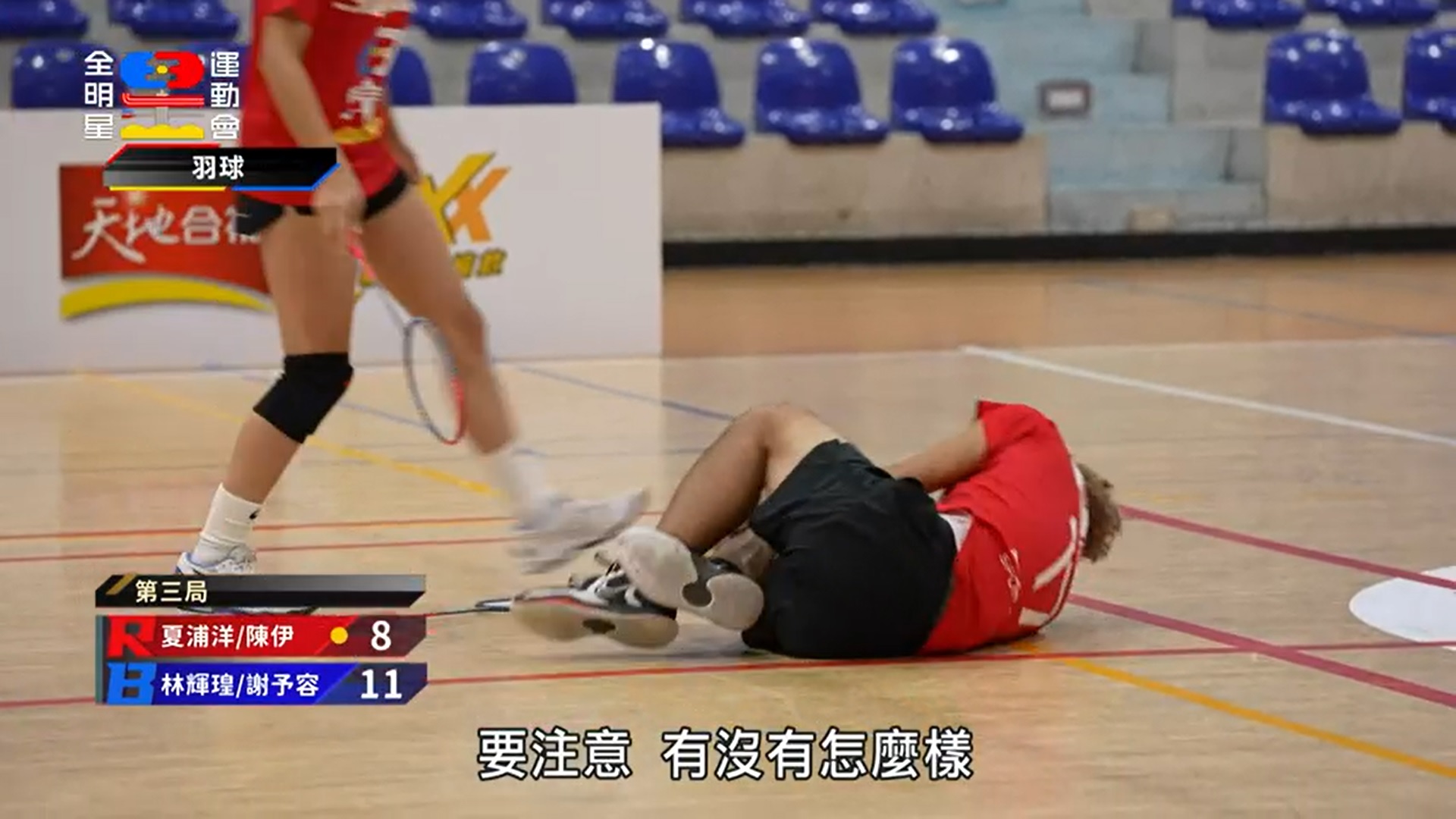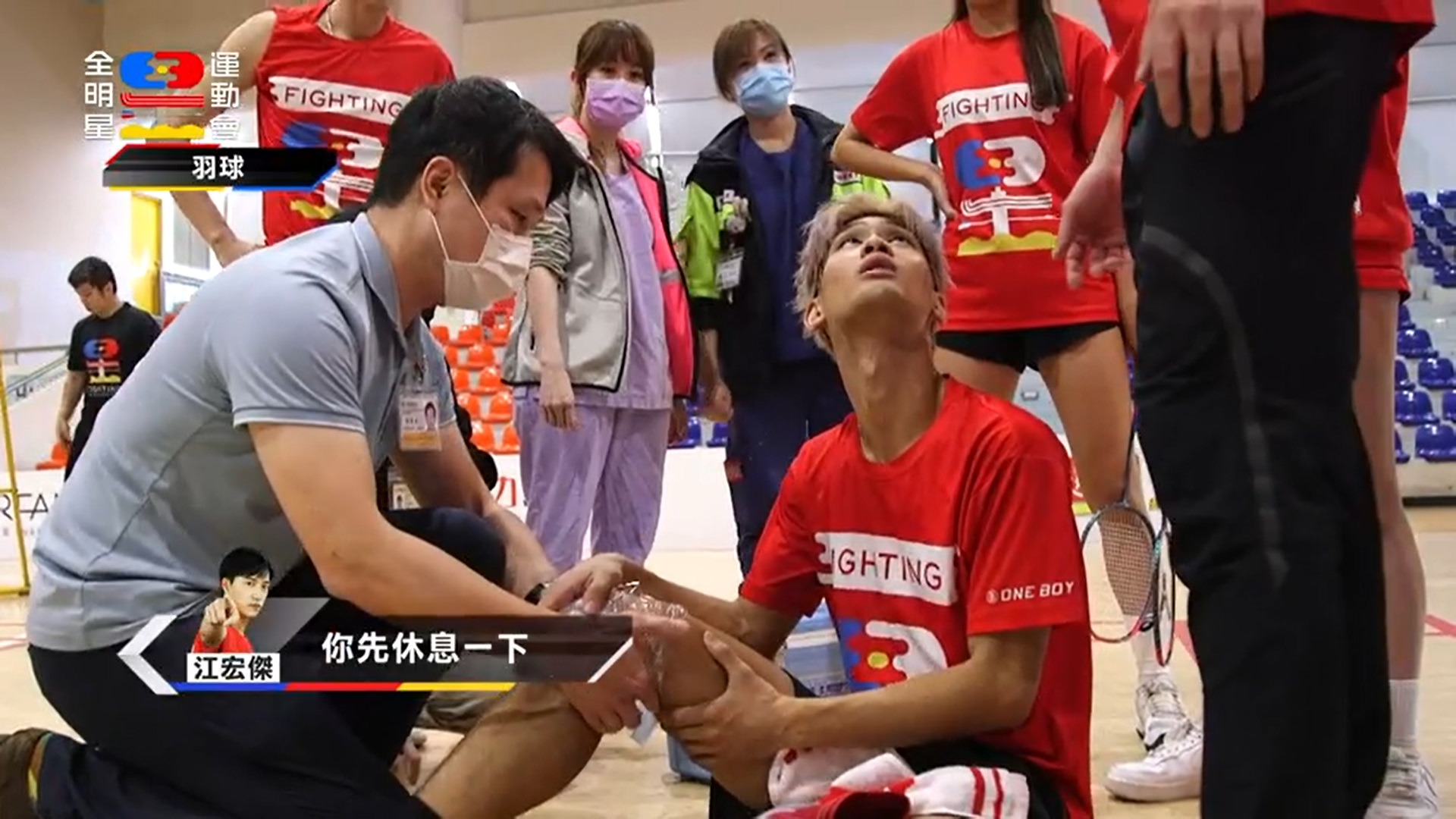 在羽球團體賽,紅藍兩隊分別在男女雙打各拿下一勝,到了混雙時,紅隊派出夏浦洋、陳伊,藍隊則派出林輝瑝、謝予容應戰。而夏浦洋在救球時,意外扭傷膝蓋,雖然他已經痛到當場在地上打滾,但仍想要堅持比完,「我覺得舒緩按摩一下,我還可以打。」但江宏傑則認為應該要立刻去醫院檢查是否有受傷,「我知道你練很久,你很想贏,但是如果這個傷再下去打,你不只影響到你之後的賽事,搞不好之後你的人生也會受到影響。」隨後便將夏浦洋送往醫院治療。