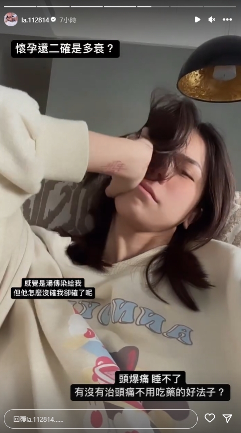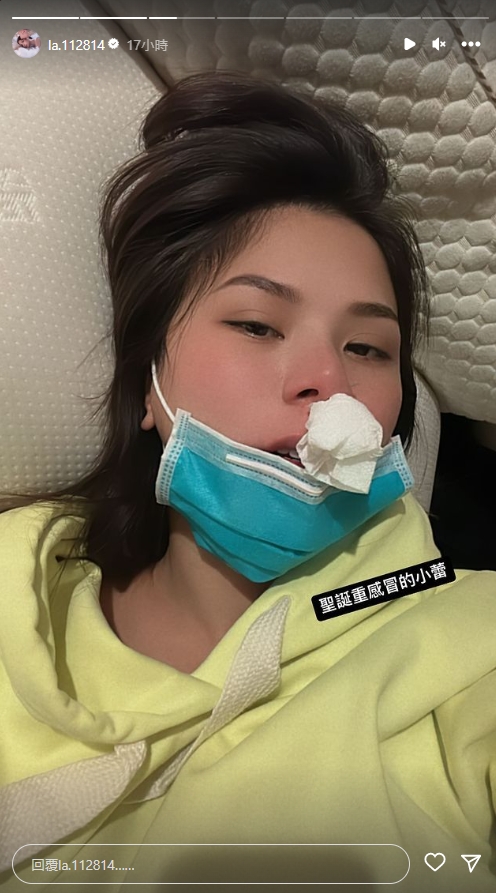 蕾菈25日在IG限時動態曬出病懨懨的照片,只見她躺在床上,鼻孔塞著衛生紙,並表示:「聖誕重感冒的小蕾」。原本以為是一般的感冒,怎料到了26日一早,她無奈表示:「懷孕還二確(二度確診)是多衰?」猜測是被湯宇傳染,但老公卻沒驗出陽性反應。而她目前的症狀是頭痛到無法入睡的程度,她也趕緊向網友求救,「有沒有治頭痛,不用吃藥的好法子?」似乎是為了寶寶,所以刻意不吃止痛藥。