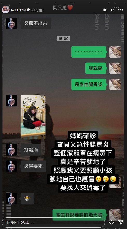 不僅如此,蕾菈在同天下午曬出跟湯宇的對話,透露大女兒得到急性腸胃炎,打點滴的時候還哇哇大哭,她無奈表示:「媽媽確診,寶貝又急性腸胃炎,整個家籠罩在病毒下,真是辛苦爹地了!照顧我又要照顧小孩,爹地自己也感冒,要找人來消毒了~」可說是禍不單行!