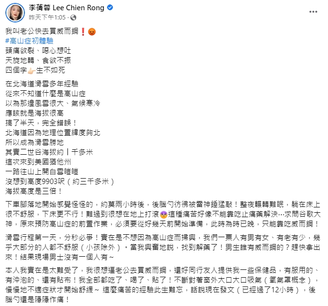 李蒨蓉在貼文中表示自己錯估情勢,因此出現嚴重的高山症,「求問谷歌大神,原來預防高山症的前置作業,必須要從好幾天前開始準備,此時為時已晚,只能靠吃威而鋼!」對此,醫師王士豪轉發相關新聞並直言:「預防高山症,不可以吃威而鋼。吃威而鋼,反而會容易誘發急性高山症,而且會讓症狀變嚴重。」如果是要對付頭痛、嘔吐為主的急性高山症,吃威爾鋼反而會讓症狀變嚴重。