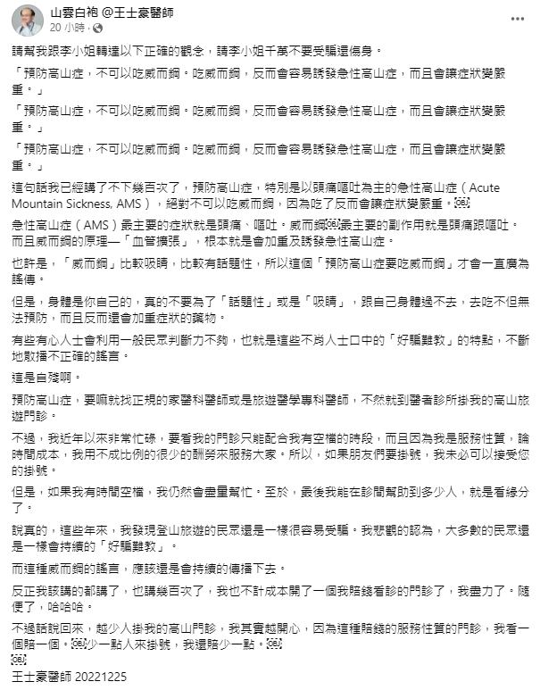 不僅如此,不肖人士還會利用民眾「好騙難教」的特性,不斷地散播謠言,但此舉就是「自殘」。王士豪透露,預防高山症最好的方式,就是要到診間求助醫師,「我該講的都講了,也講幾百次了」,但是很多民眾依舊容易受騙,因此認為謠言會持續傳播下去。