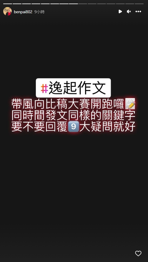 如今事情一件件爆出,阿Ben直言:「媒體所統整的9大疑問都是要出面解釋清楚並且付上代價的,請不要因為這事件的發生,而絆倒人,污衊所謂上帝的真理!」接著27日凌晨,他不滿發文:「帶風向比稿大賽開跑囉!同時間發文、同樣的關鍵字,要不要回覆9大疑問就好?」並Hashtag「逸起作文」,正式開戰。