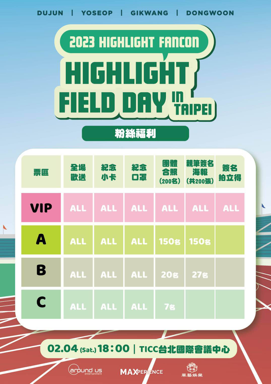 為紀念出道13週年,HIGHLIGHT運動會預計將獻唱超過十首好歌,包含「DAYDREAM」、「PLAY」、「Alone」等,運動會售票日訂為2023/1/8(日)PM1:30,於全省IBON機台與網站系統啟售,票價分為VIP、A、B、C區塊,VIP區「NT$5,800」、A區「NT$5,200」、B區「NT$4,200」、C區「NT$3,200」與身障席「NT$2,900」,購票網址:https://ticket.ibon.com.tw/ 。福利上,HIGHLIGHT當天也絕不讓心愛的Light粉空手而歸,因此全場每一位粉絲將獲得專屬紀念小卡、限定版口罩與運動會結束後,四帥本尊將一一親自歡送大家安全賦歸的心意!不光如此,還有共200張的親簽海報、簽名拍立得與團體合照等福利也要送給大家!