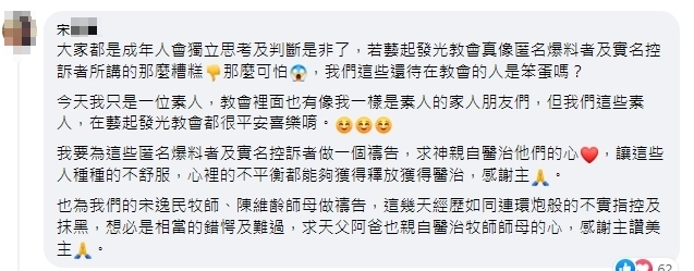「藝起發光」26日二度發文回應爭議事件,眾多教友現身力挺,就連小甜甜的老公都表示:「大家都是成年人,會獨立思考及判斷是非了,若藝起發光教會真像匿名爆料者及實名控訴者所講的那麼糟糕、那麼可怕,我們這些還待在教會的人是笨蛋嗎?」透露教會裡面也有其他素人,大家都過得很好。