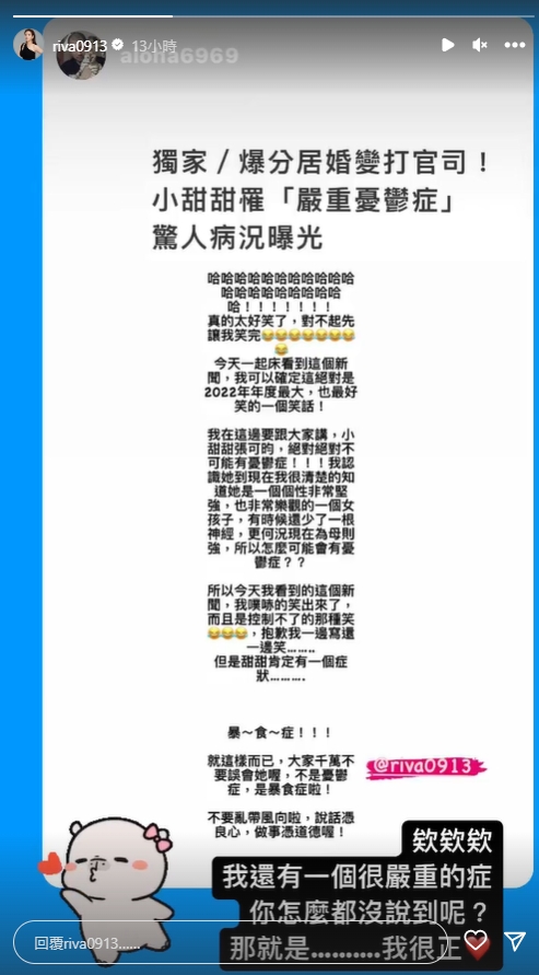 金剛透露小甜甜是一位個性非常堅強且樂觀的女孩,甚至還會少一根筋,再加上現在已經當了媽媽,為母則強,「所以怎麼可能會有憂鬱症?」因此當他看到新聞時便忍不住噗哧大笑!更笑虧:「但是甜甜肯定有一個症狀……暴〜食〜症!就這樣而已,大家千萬不要誤會她喔。」最後,他希望大家不要亂帶風向,要有憑有據的說真話。對此,小甜甜轉發該動態並表示:「欸欸欸!我還有一個很嚴重的症,你怎麼都沒說到呢?那就是……我很正!」幽默化解壞事。