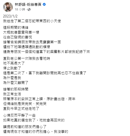 林舒語2日在臉書曬出一張躺在病床上的照片,只見她吊著點滴,虛弱地躺在床上,她遺憾表示:「我送走了第二個忘記帶東西的小天使」,形容這段時間的心情就像雲霄飛車一樣,一開始發現懷孕感到很開心,還錄下朋友們得知喜訊後的模樣,「直到老公第一次陪我去看祂時,祂不再長大了,停止跳動了,這是第二次了。」她心痛表示:「當下我離開診間就再也忍不住崩潰了,為什麼是我?為什麼又離開了?」一時之間難以接受。