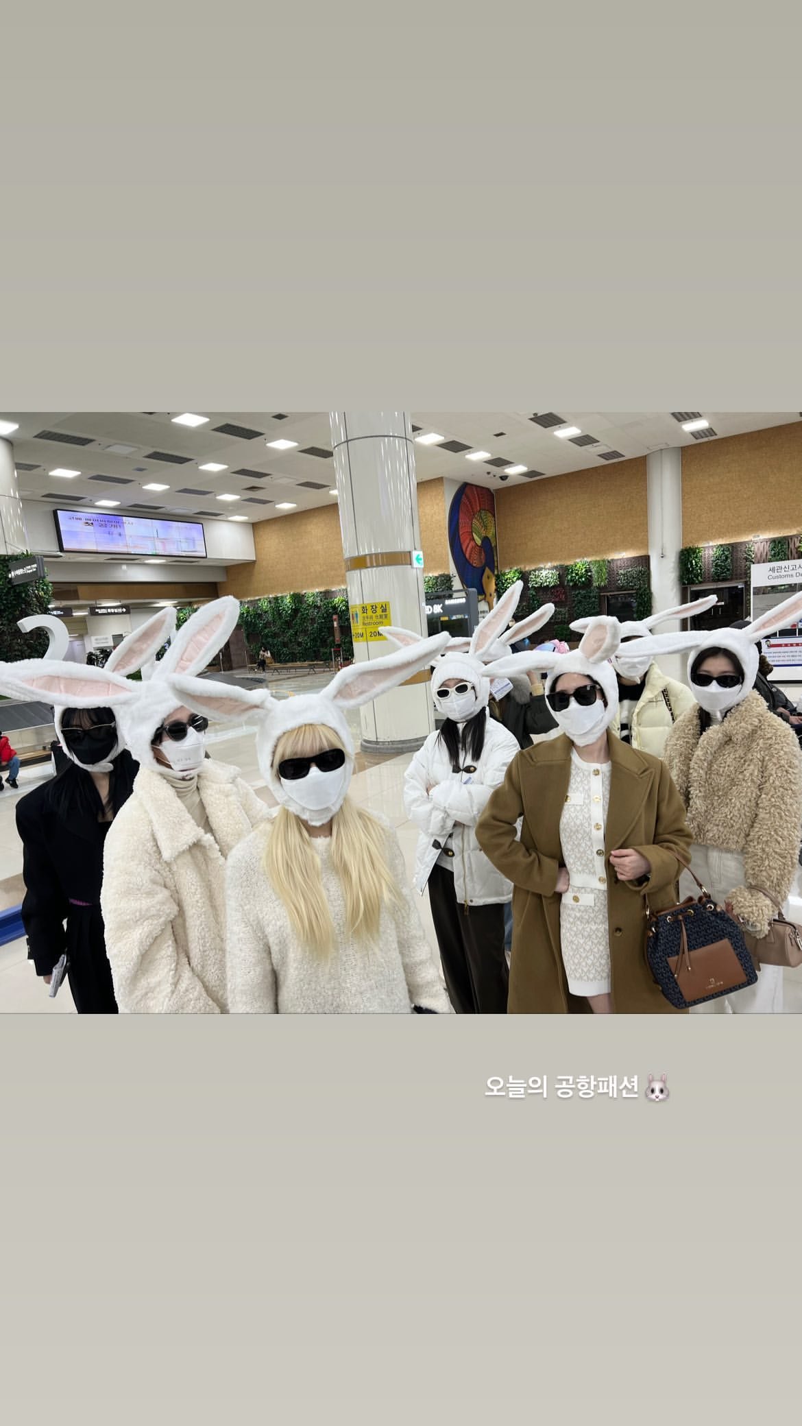 TWICE成員在結束完日本紅白行程後,於1日返回韓國金浦機場,當天9位成員除了因為素顏戴上口罩以及墨鏡外,更還戴上了兔子造型的頭套,以迎接兔年的來臨,而多賢也曬出了多張團體照片並寫道,「今天的機場時尚。」