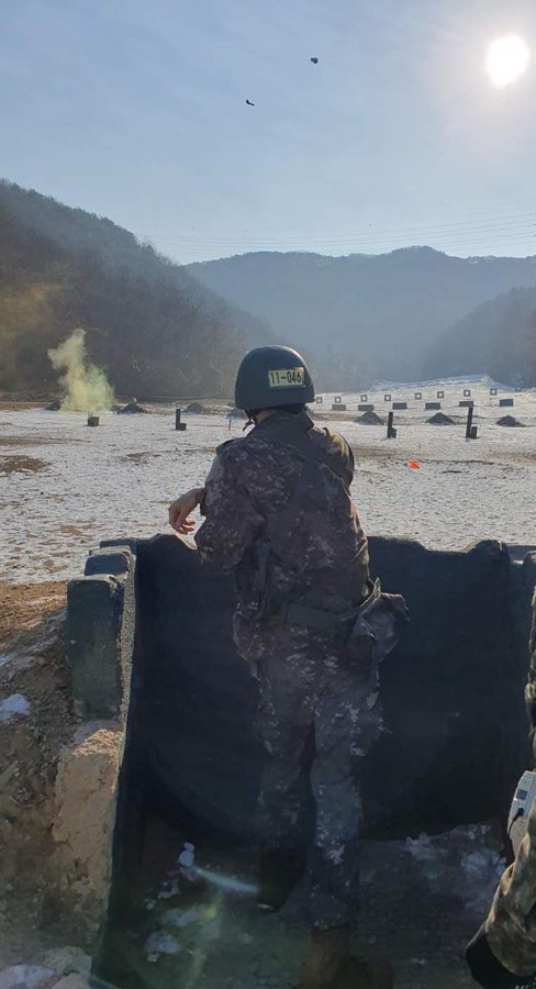 而除了生化防護訓練外,Jin還有一張手榴彈訓練的照片曝光,雖然畫面並沒有拍到臉部,但是從背影以及冉冉上升的煙霧仍可感受到Jin在訓練時的嚴肅。