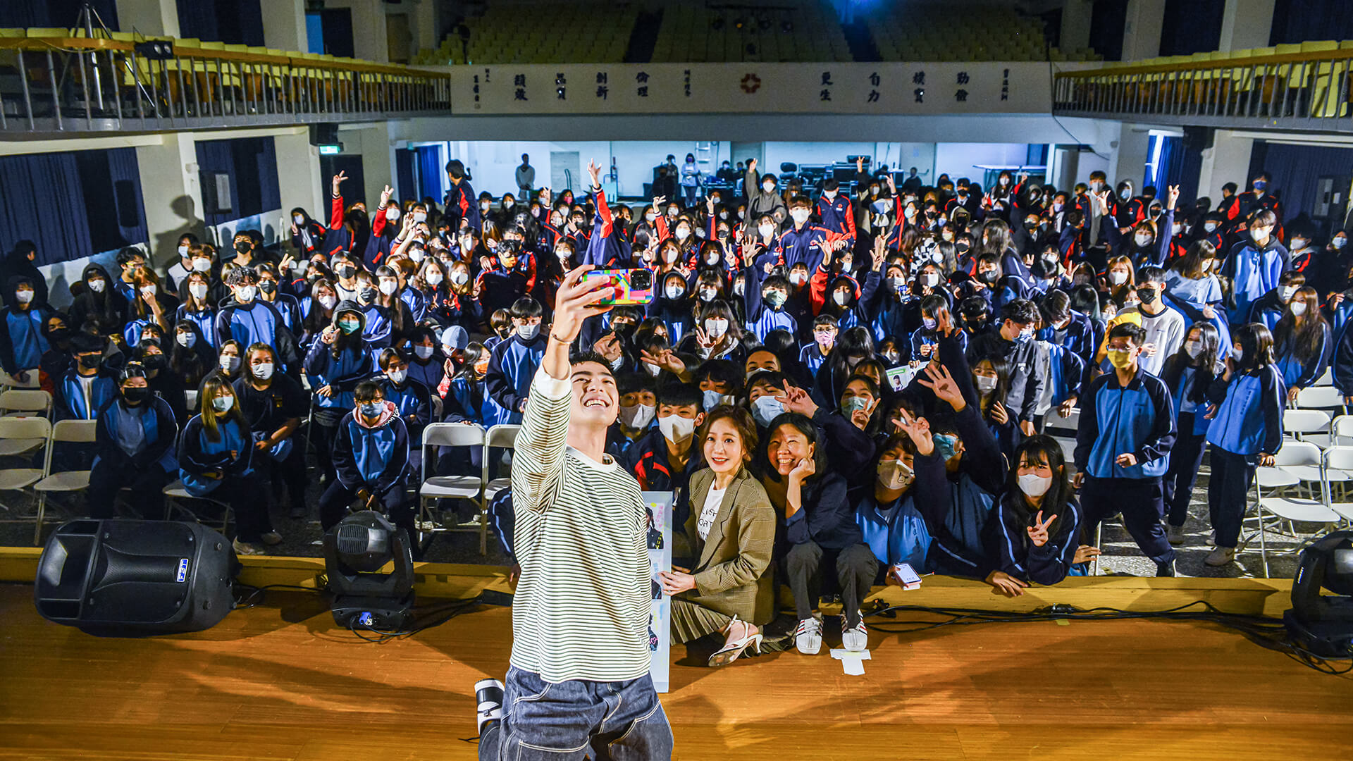 《第9節課》播出至今多次翻轉、角色關係環環相扣、心境層次複雜,每集都丟出不同轉折、線索,最新一集校園風波不斷,再爆出匿名舉報黑函指控陳昊森性騷擾、尹馨霸凌老師,讓觀眾跟著劇情發展抽絲剝繭,紛紛預測幕後大魔王,以及首集陳昊森拿著刀、許瑋甯倒在血泊中的事件發生真相到底為何,熱議不斷,陳昊森也透露:「最後一集的翻轉絕對會讓大家意想不到、大吃一驚。」昨(5日)在劇中飾演關係緊張、氣氛時常劍拔弩張的母子檔陳昊森和尹馨為宣傳《第9節課》攜手編劇李旭敏重返《第9節課》其中之一的學校場景,驚喜現身臺北育達高中校園,大談角色塑造與拍攝幕後,還在現場與表藝科同學重現劇中刺激壁咚片段的對戲互動環節,陳昊森深情對戲引全場驚呼連連,台下騷動不斷。