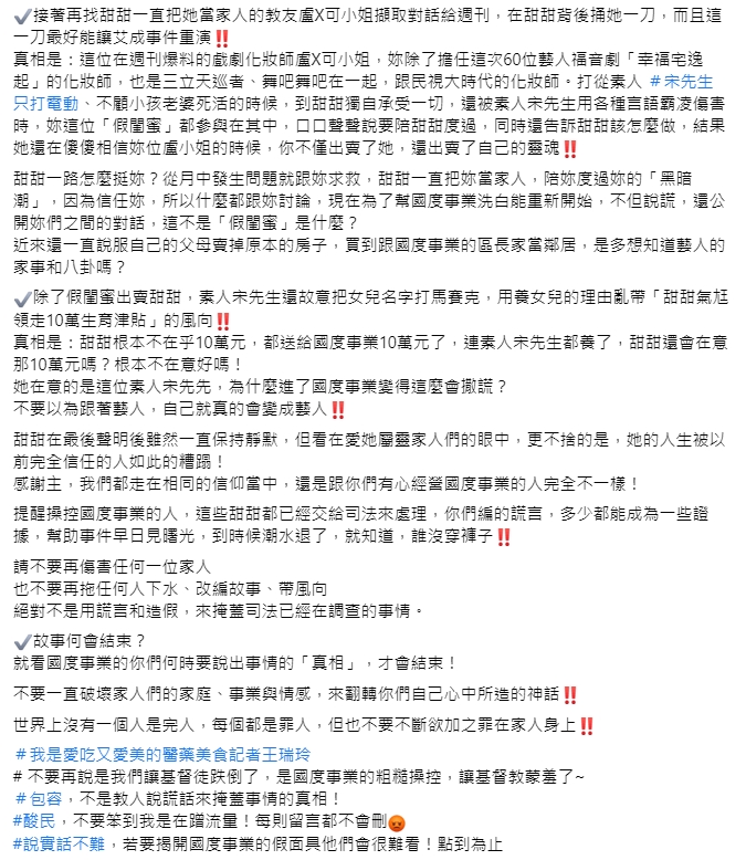 針對小甜甜好友的爆料,王瑞玲9日指出爆料者盧姓女子從頭到位都知道宋先生是如何對待女方,「口口聲聲說要陪甜甜度過,同時還告訴甜甜該怎麼做,結果她還在傻傻相信妳位盧小姐的時候,你不僅出賣了她,還出賣了自己的靈魂!」透露自事件爆發後,小甜甜就一直向盧小姐求救,因為信任才會跟她討論,沒想到對方現在竟然為了幫協會洗白而出賣好友,讓她氣到怒批:「這不是『假閨密』是什麼?」