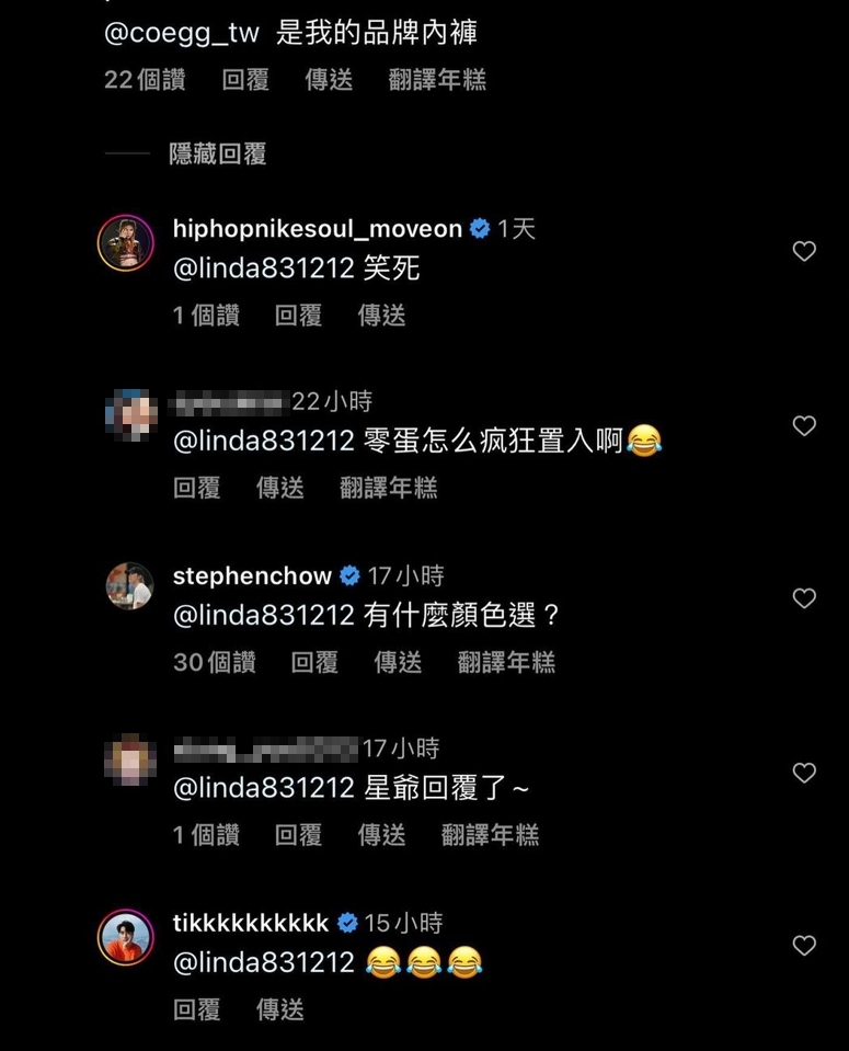 事實上,除了黃鐙輝之外,網紅琳妲也曾在留言區許願,「星爺,我想送你我的內褲」,隨後才補充解釋是自創品牌的內褲。沒想到過了一天後,周星馳本尊還真的現身回覆,「有什麼顏色選?」讓琳妲見狀興當驚喜,將畫面截圖PO在個人版面並驚訝表示,「原來星爺真的會回覆,好神奇哦!」